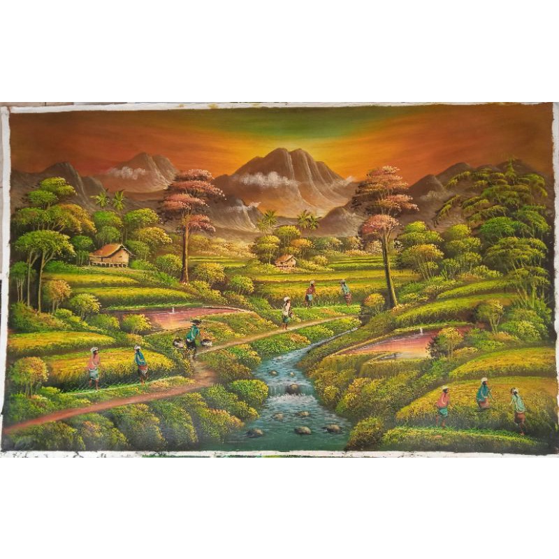 Lukisan pemandangan yang indah ini, beserta hamparan sawah yang telah panen, menyimbolkan kemakmuran dan kelimpahan rejeki, menciptakan keadaan yang makmur dan . Lukisan pemandangan sawah padi ini berpandukan gambar sawah padi yang di ambil di sungai petani kedah.teknik lukisan ini menggunakan catan . Lukisan pemandangan gunung dan sawah 85 x 135 cm. Para petani di sawah itu terlihat sedang menanam padi. Paint by number lukisan pemandangan air terjun 40x50cm.